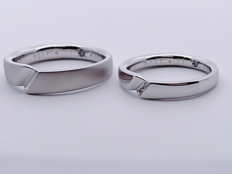 「2017年にジュエルミキさんでコラニーのマリッジリングを購入しました。とても気に入った結婚指輪だったので、ほぼ毎日ずっとつけっぱなしの状態です。それでも変形することなく安心してつけていられる指輪です。サイズがちょっとキツくなったのでサイズ直しの依頼で持ってきました。修理をお願い致します。」と、来店予約をされてから、お二人でご来店されました。