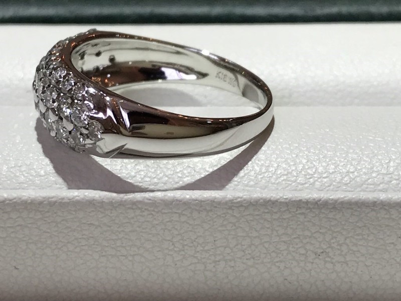 他のジュエリーショップや宝石店では断られて当店へお問い合わせを頂きました。18金ホワイトゴールドのダイヤモンドリング。金色に変色してしまったホワイトゴールドを、購入時の通り白色に戻してほしいというご依頼です。