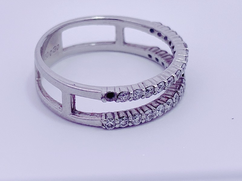 素材はプラチナ900、ダイヤモンドのデザインリングです。2か所のメレダイヤモンドが外れていました。サイズも1号アップをご希望でした。