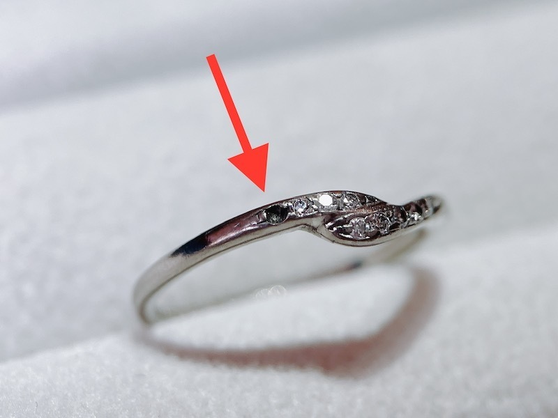 「いつも身につけているプラチナのダイヤモンドリングです。10年ほど前に大型ショッピングセンターに入っている宝石店で購入しました。気が付いたらダイヤモンドが2か所外れていました。修理をしてもらえるジュエリーショップを知人に尋ねたらジュエルミキさんを紹介されたので、大分市内にきたついでに寄ってみました。他店で購入した指輪ですが修理してもらえますか?ついでにサイズも少し大きくしてもらいたのですが。」と、ご来店されました。